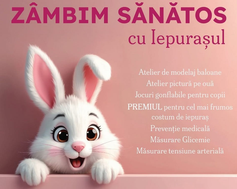 Va fi acordat premiul pentru cel mai frumos costum de iepuraș, măsrarea glicemiei și a tensiunii arteriale. Prevenție medicală.