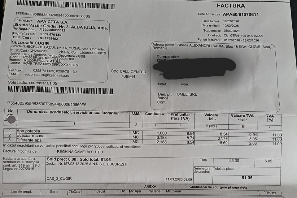 Pe factura postată pe rețelele de socializare apare un consum clar de 1 mc de apă, 3,188 mc evacuare canal și 2,188 mc pierderi. Totalul pentru cei peste 6 mc de apă facturați este de 61.05 lei, din care apa consumată efectiv ar costa 9,48 lei.